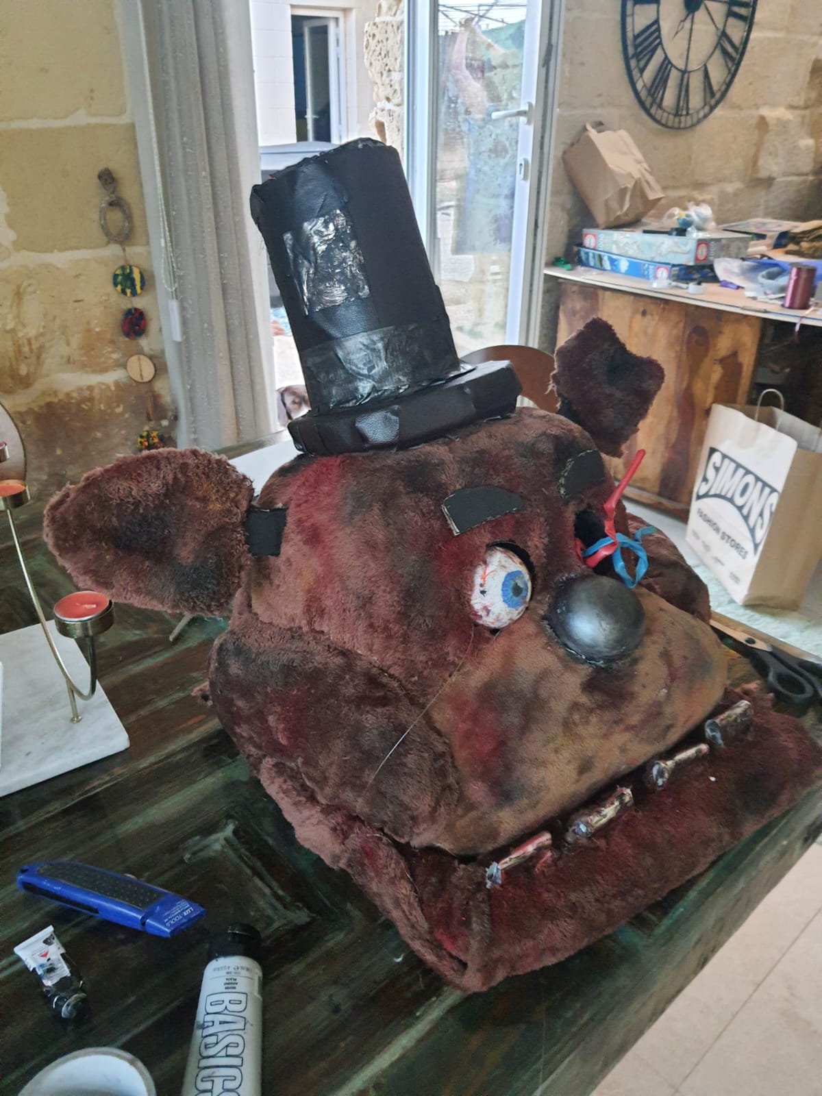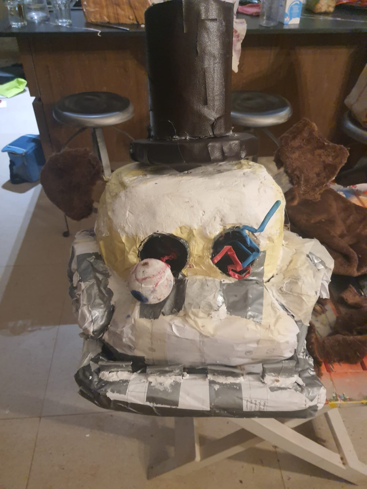 This is the FNAF Freddy head and Crying Child mask I made from my first con I went to. Making them were fun cause I used recycled things I had around my house to make both of them.