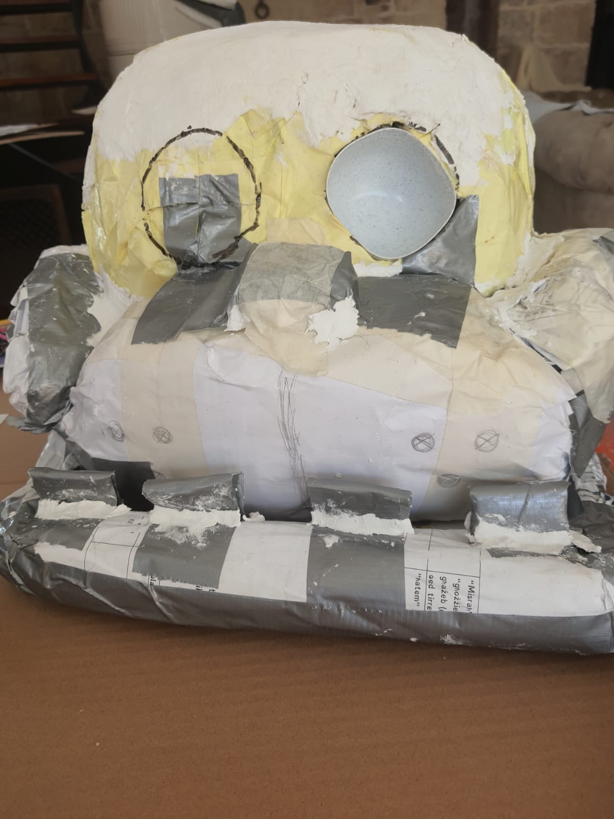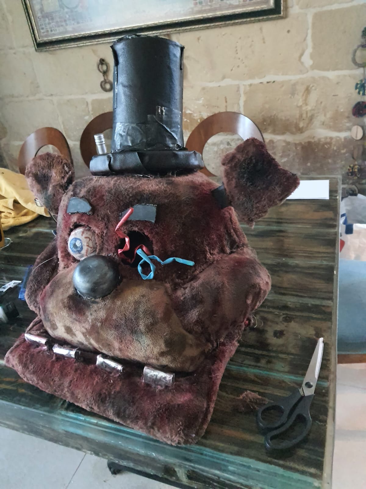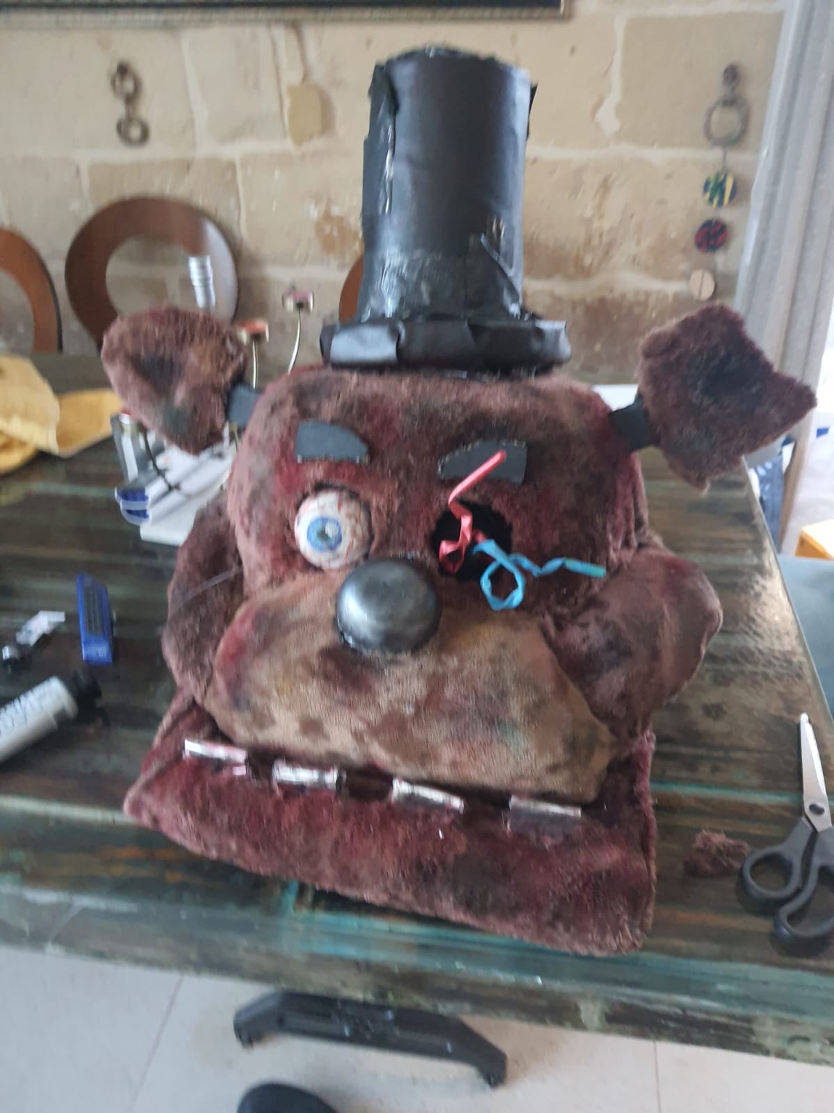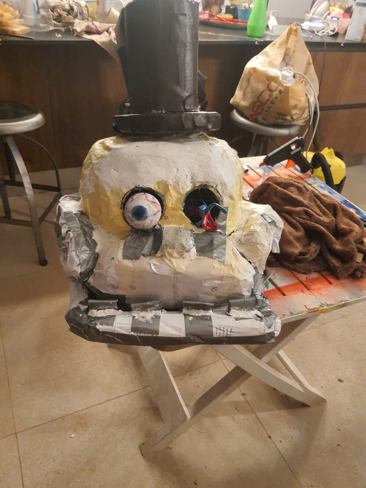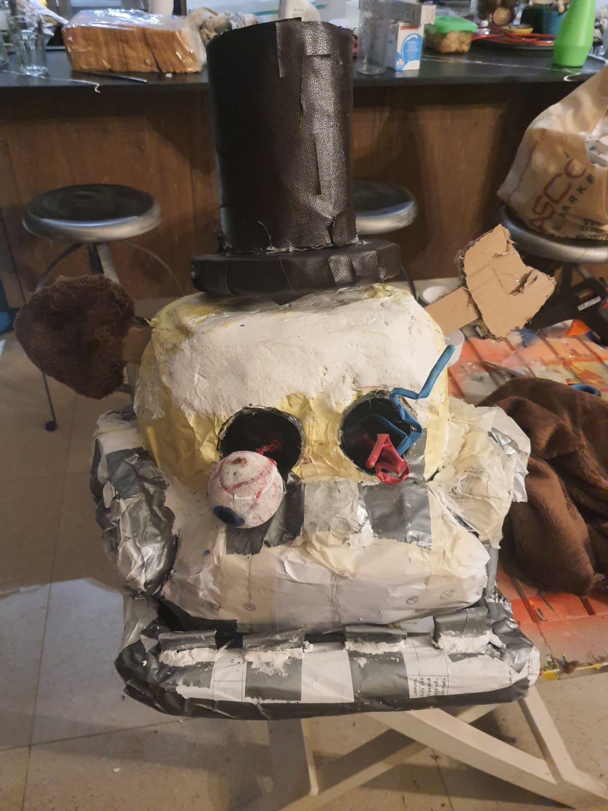 This is the FNAF Freddy head and Crying Child mask I made from my first con I went to. Making them were fun cause I used recycled things I had around my house to make both of them.